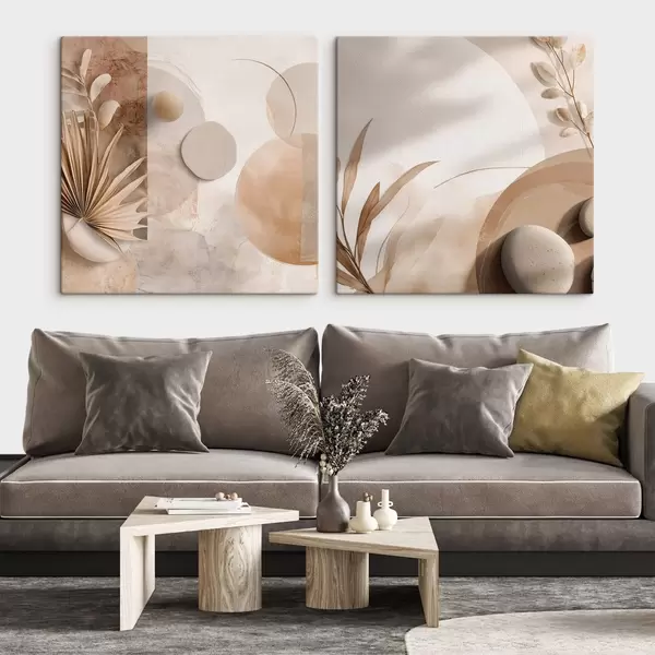 Tableau Deux toiles avec des feuilles séchées et des formes texturées Nr m00893