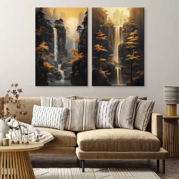 Tableau Paysage avec cascade et montagnes baignés d'une lumière dorée Nr m00928