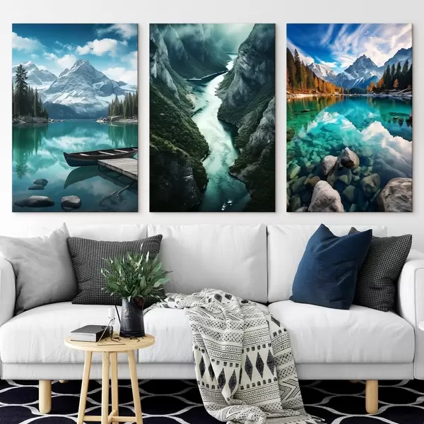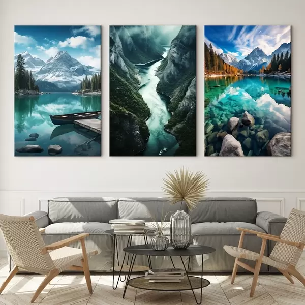 Tableau Lacs alpins et vues sur les fjords dans des tons bleu sarcelle frais m00961