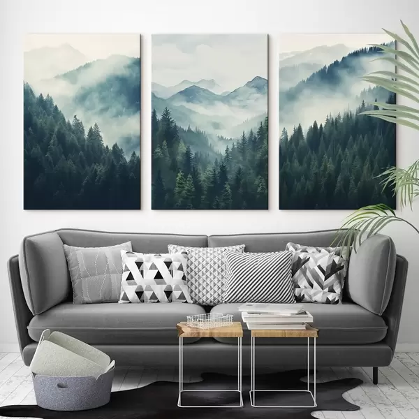Tableau Des montagnes brumeuses couvertes de pins, parsemées de tons verts et bleus doux. Nr m00964