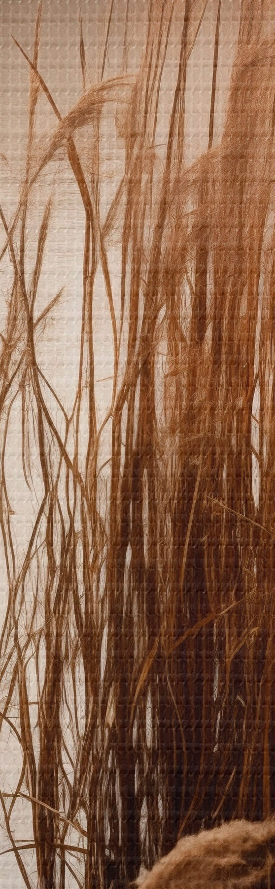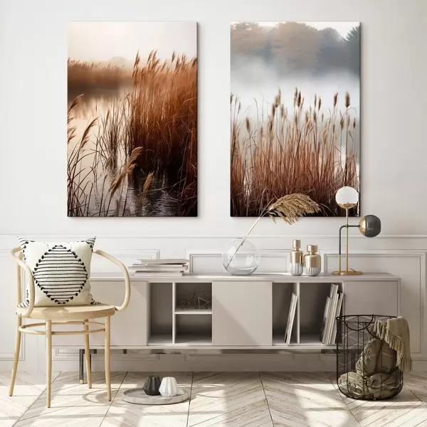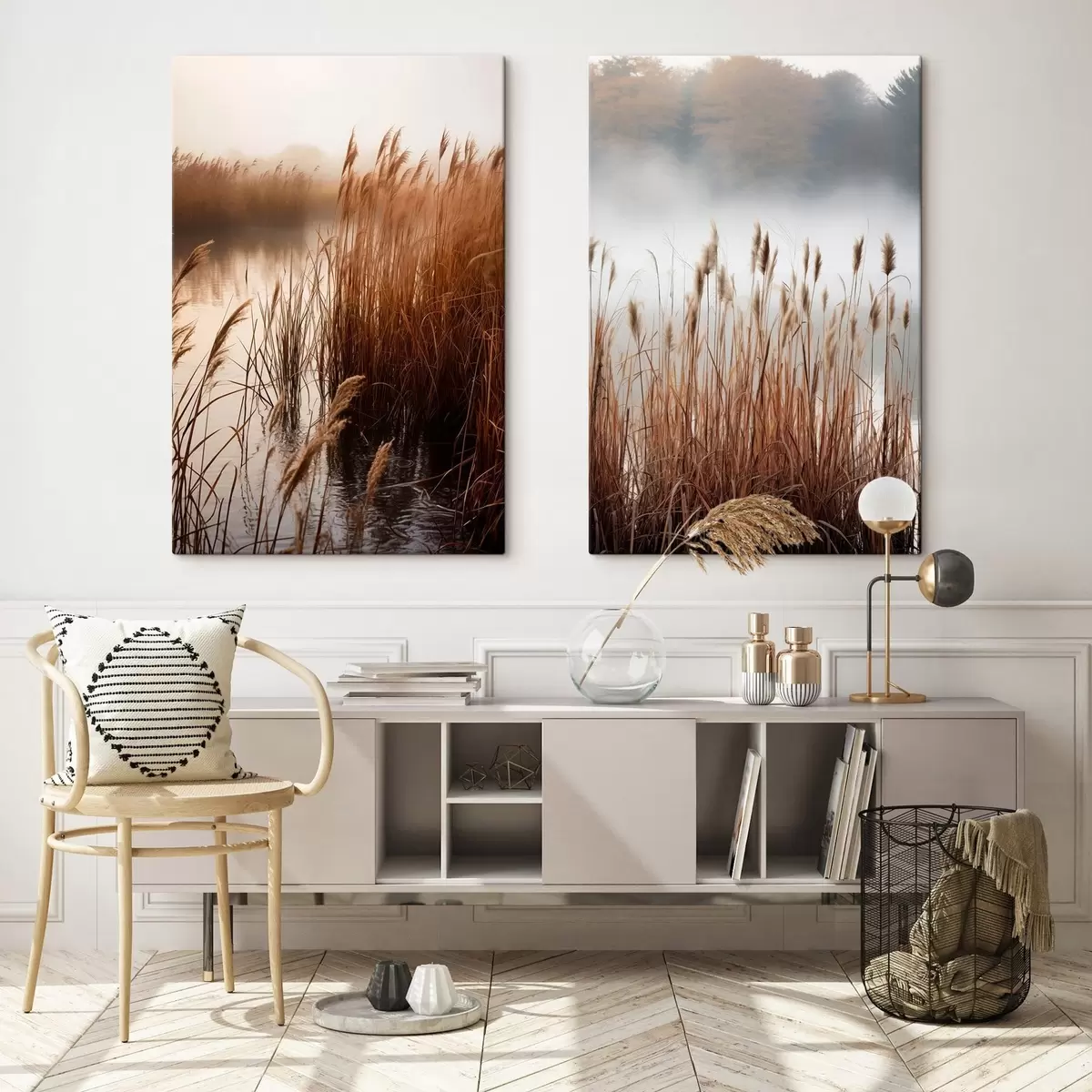 Tableau De grands roseaux poussant dans un plan d'eau, l'eau reflète les roseaux, arrière-plan brumeux, lumière douce, scène naturelle Nr m01008