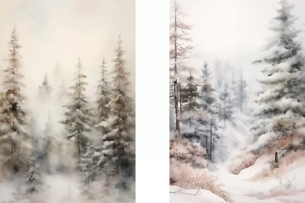 Tableau De grands pins recouverts de neige, dressés dans une forêt brumeuse, une scène hivernale douce et feutrée. m01011
