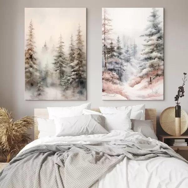 Tableau De grands pins recouverts de neige, dressés dans une forêt brumeuse, une scène hivernale douce et feutrée. Nr m01011