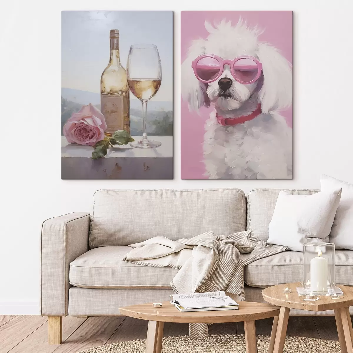 Tableau Une bouteille, un verre de vin et un caniche portant des lunettes, peinture imitation Nr m01021