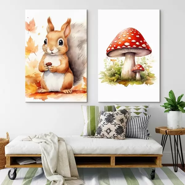 Tableau Écureuil et champignon des bois, amanite tue-mouche, imitation aquarelle Nr m01049