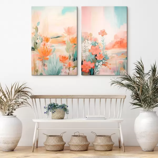 Tableau Motifs floraux aux tons pastel sur fond de vallée brumeuse et lumineuse Nr m01085