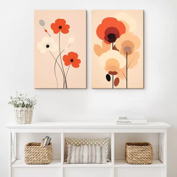 Tableau Diptyque floral minimaliste dans des tons chauds beige-corail avec des lignes graphiques m01090