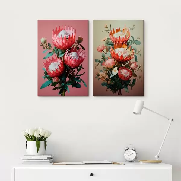 Tableau Proteas dans deux ambiances : fond rose intense et dégradé olive chaud m01092
