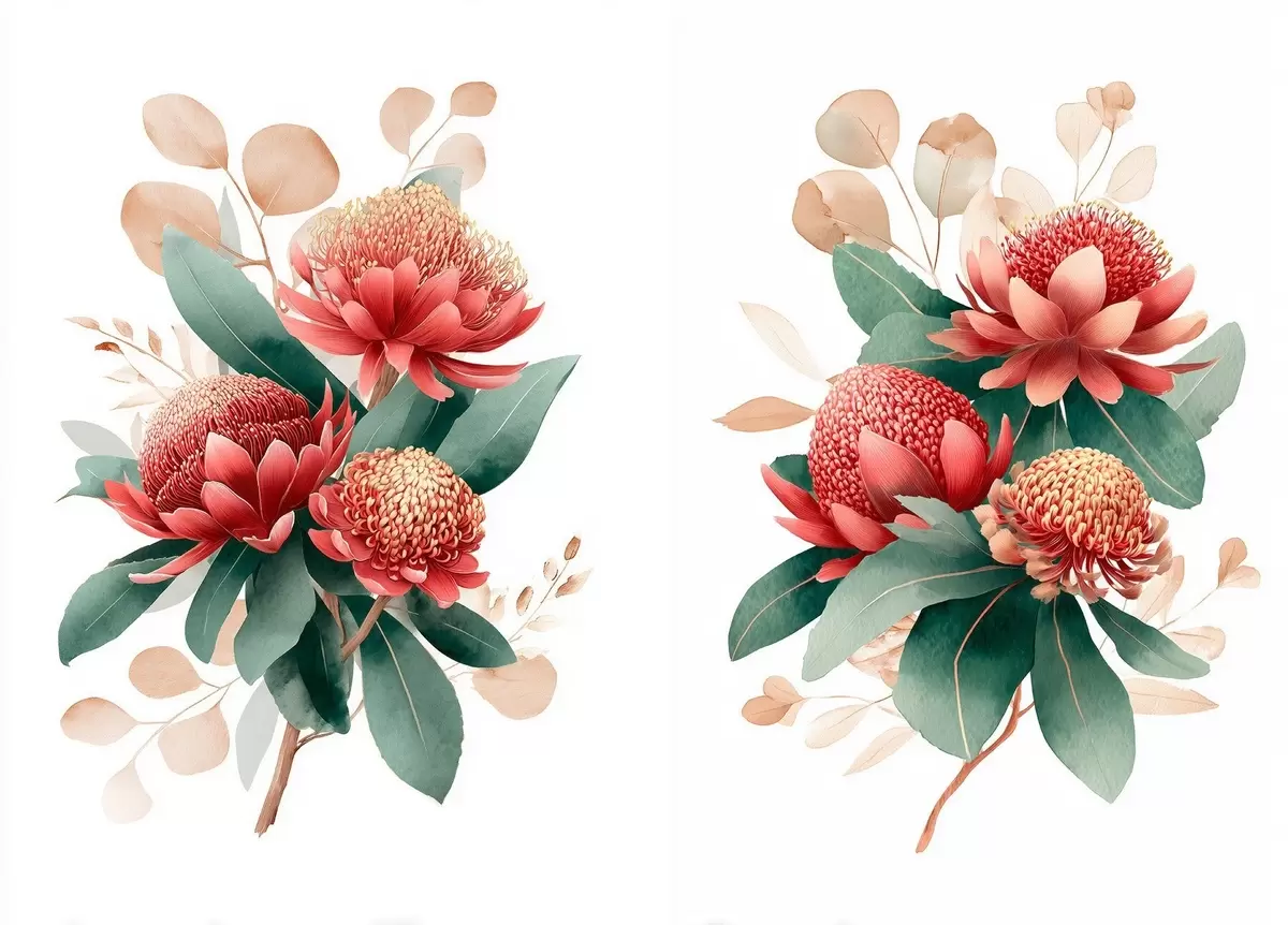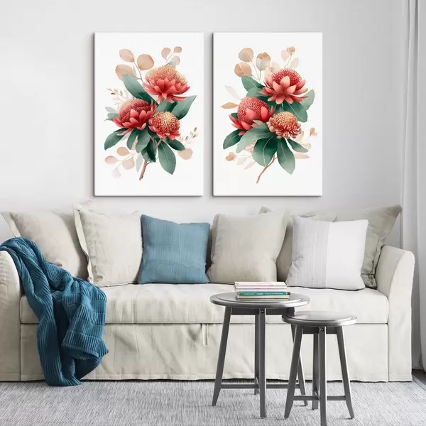 Tableau Composition florale avec des protéas dans une palette rouge corail sur fond blanc Nr m01096