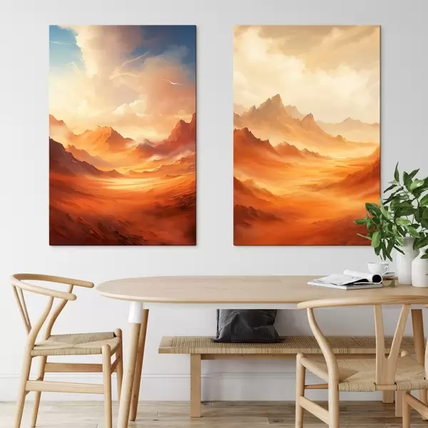 Tableau Un vaste paysage désertique orange avec des montagnes rocheuses imposantes sous un ciel brumeux et ensoleillé, parsemé de nuages vaporeux. m01122