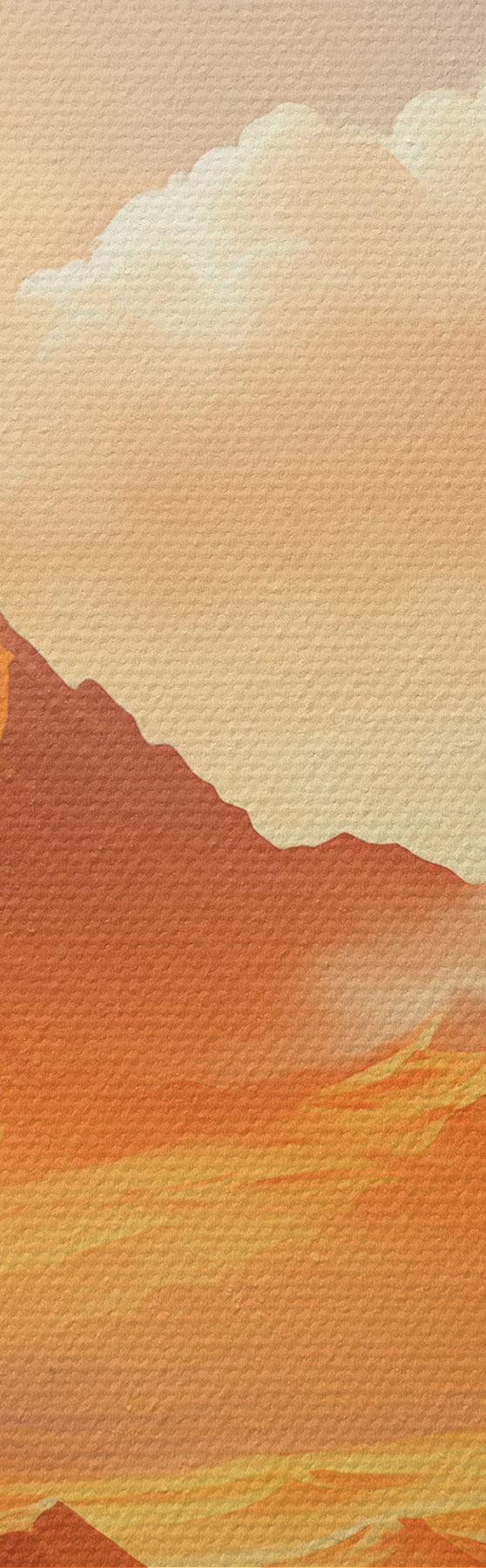 Tableau Un vaste paysage désertique orange avec des montagnes rocheuses imposantes sous un ciel brumeux et ensoleillé, parsemé de nuages vaporeux. Nr m01122