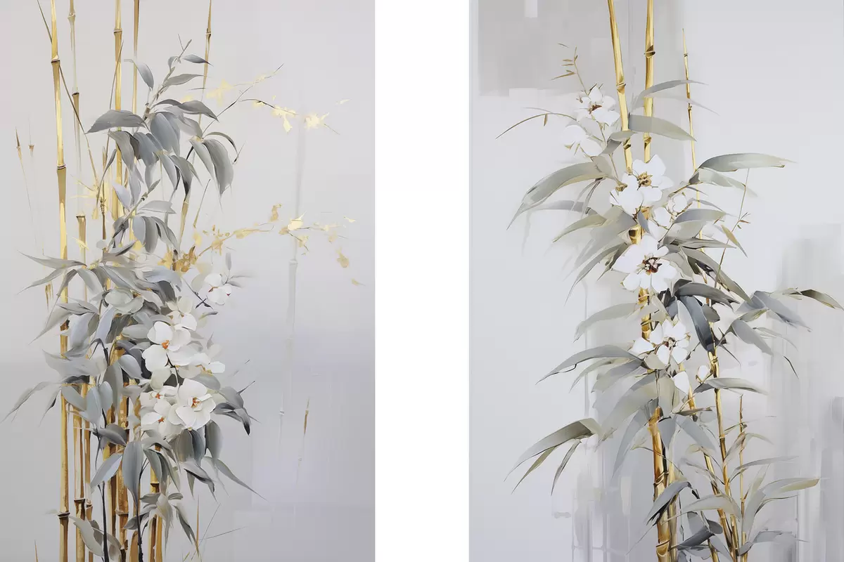 Tableau Tiges de bambou abstraites avec des accents jaunes, des fleurs blanches délicates et des feuilles vert pâle, fond gris m01127