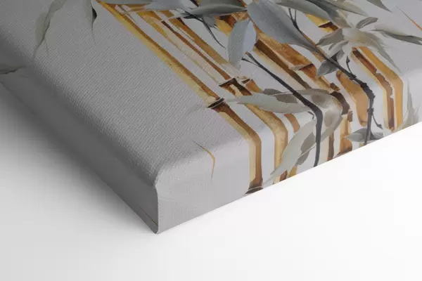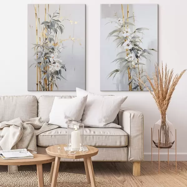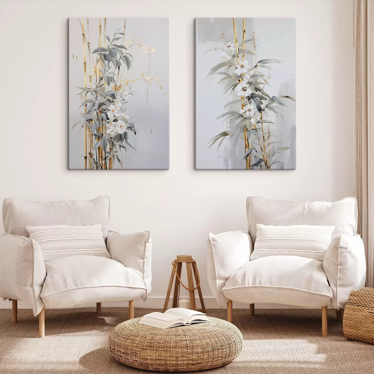 Tableau Tiges de bambou abstraites avec des accents jaunes, des fleurs blanches délicates et des feuilles vert pâle, fond gris Nr m01127
