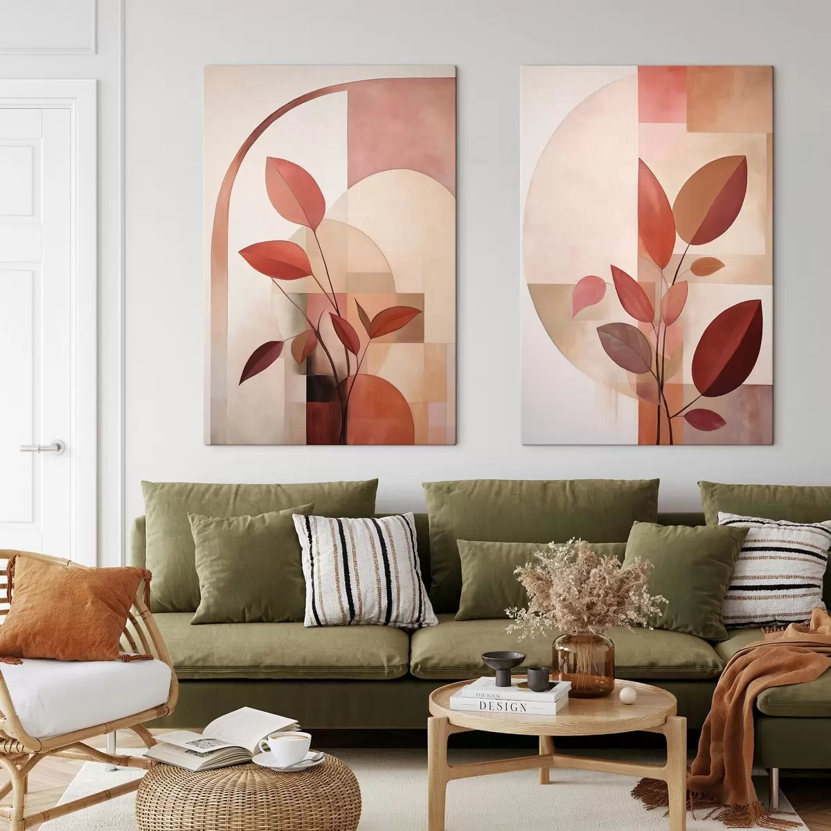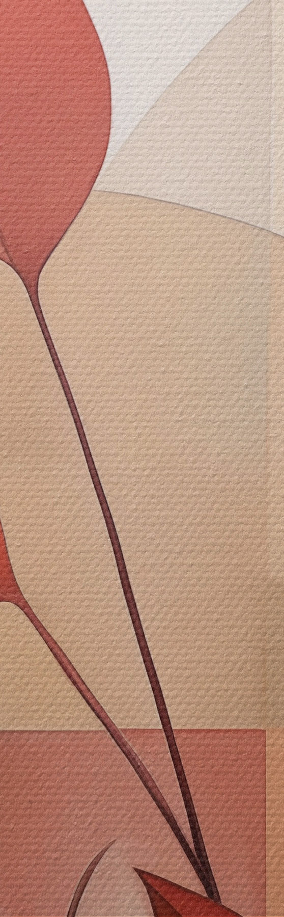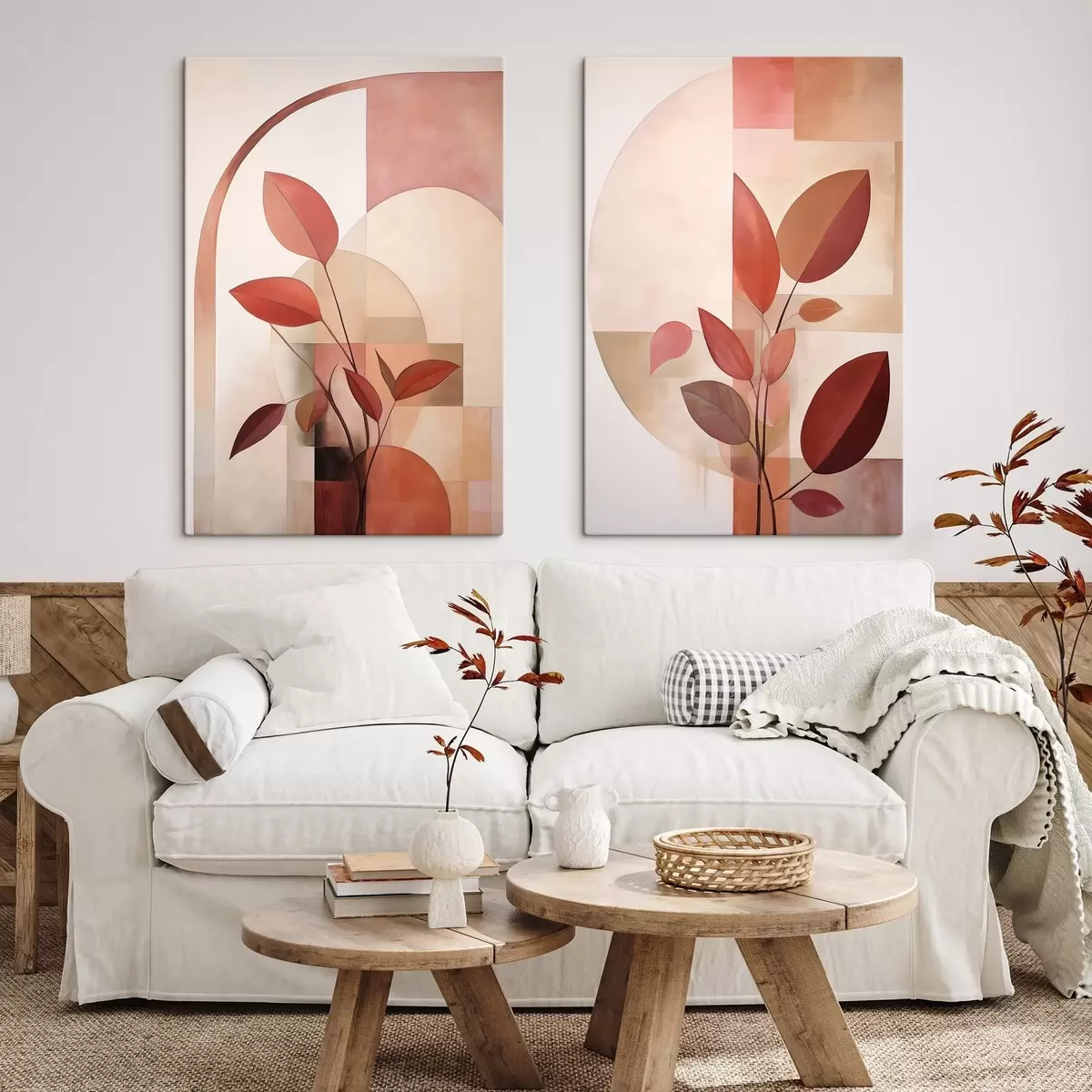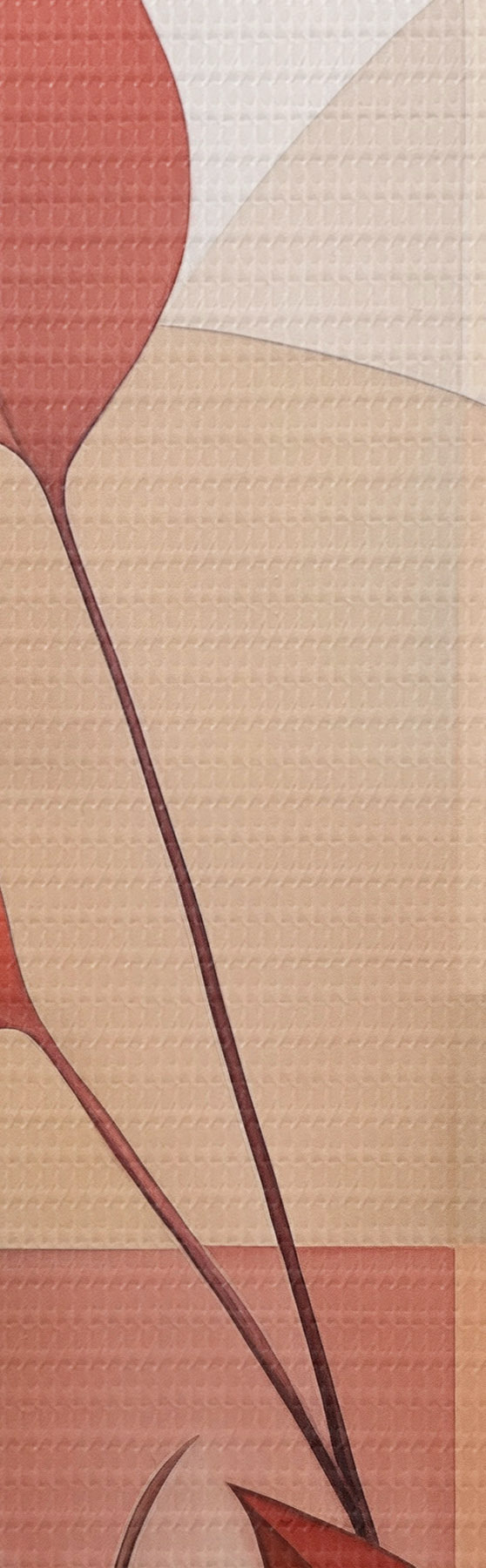 Tableau Plante abstraite aux feuilles rouges sur fond de formes géométriques et de couleurs douces et discrètes Nr m01128