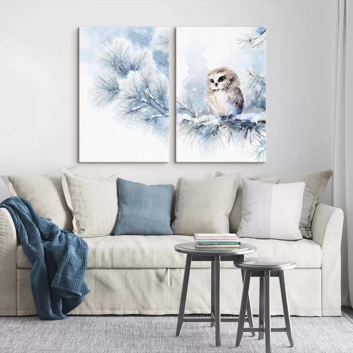 Tableau Jolie chouette sur une branche de pin enneigée, peinte à l'aquarelle m01168