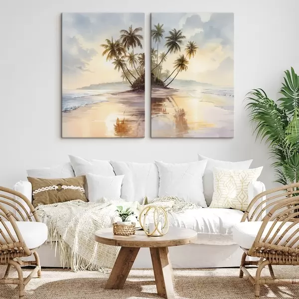Tableau plage au coucher du soleil sur une île, style aquarelle Nr m01177