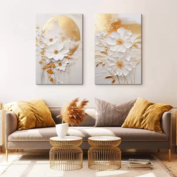 Tableau Fleurs blanches rehaussées de touches jaunes et feuilles délicates sur fond texturé, art moderne m01233