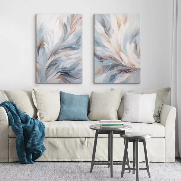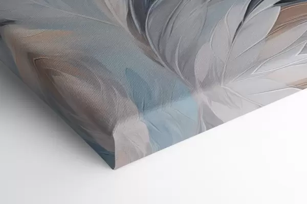 Tableau Peinture abstraite représentant des plumes dans des tons blancs, bleus et bruns, avec une texture douce et fluide et un fond clair. m01234