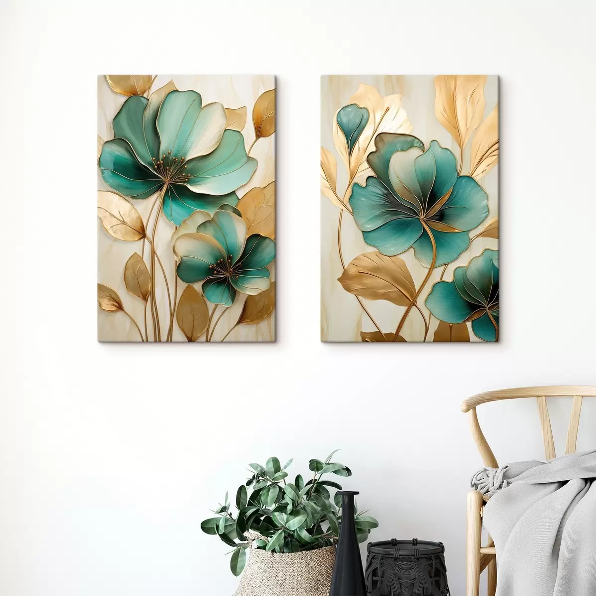 Tableau Grandes fleurs bleu sarcelle et jaunes avec contours, entourées de feuilles jaunes sur fond abstrait m01235