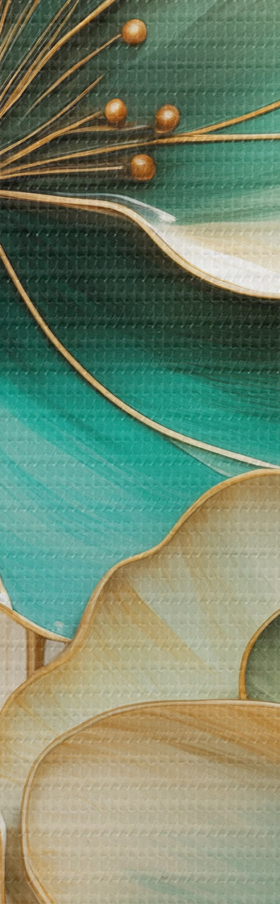Tableau Grandes fleurs bleu sarcelle et jaunes avec contours, entourées de feuilles jaunes sur fond abstrait Nr m01235