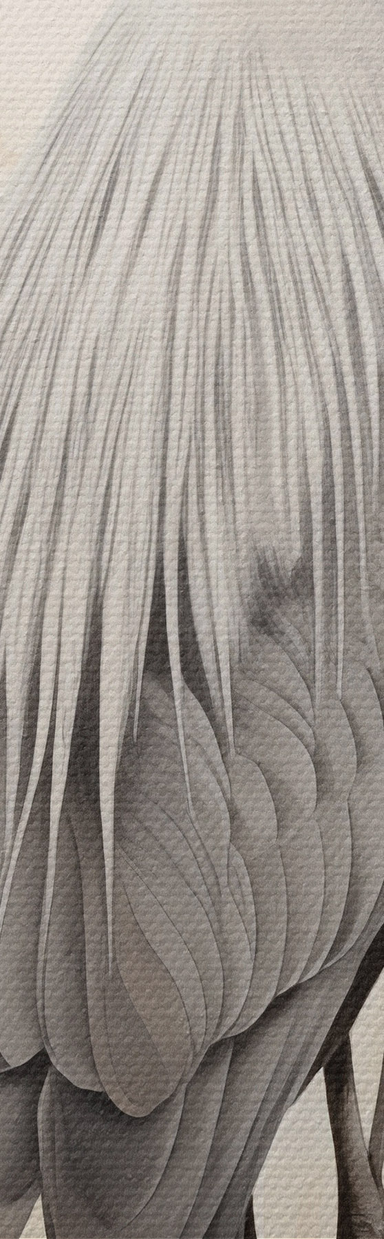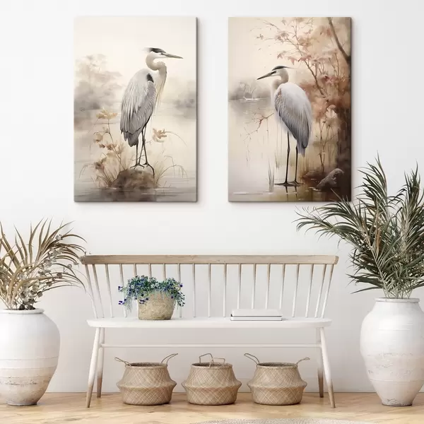 Tableau Un héron se tient sur un rocher dans un lac, avec de hautes herbes et des arbres en arrière-plan. m01239