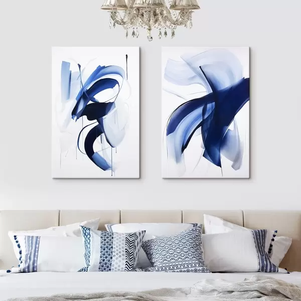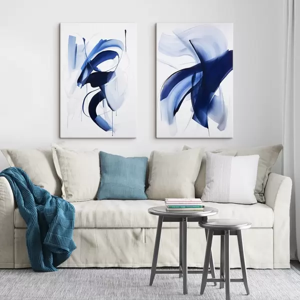 Tableau Formes abstraites bleues ressemblant à des coups de pinceau, avec des lignes et des courbes fluides sur fond blanc, art moderne. m01240