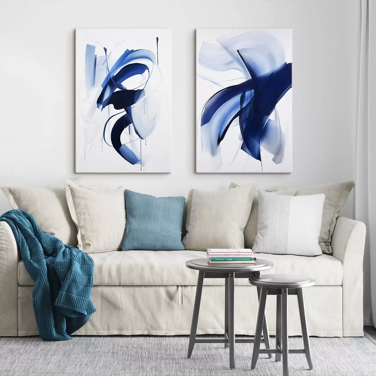 Tableau Formes abstraites bleues ressemblant à des coups de pinceau, avec des lignes et des courbes fluides sur fond blanc, art moderne. Nr m01240