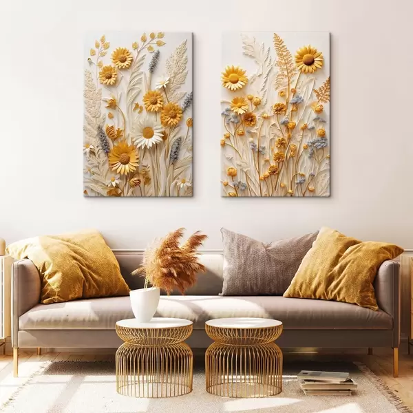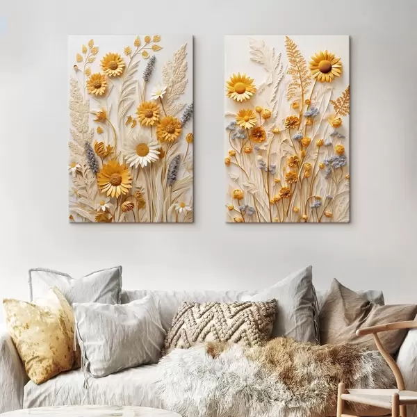 Tableau Une collection texturée de marguerites jaunes et blanches avec des herbes séchées et des brins de lavande sur fond blanc. m01241