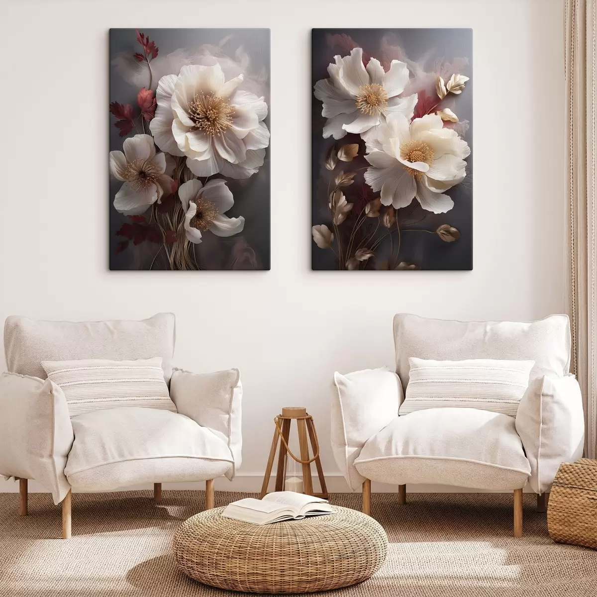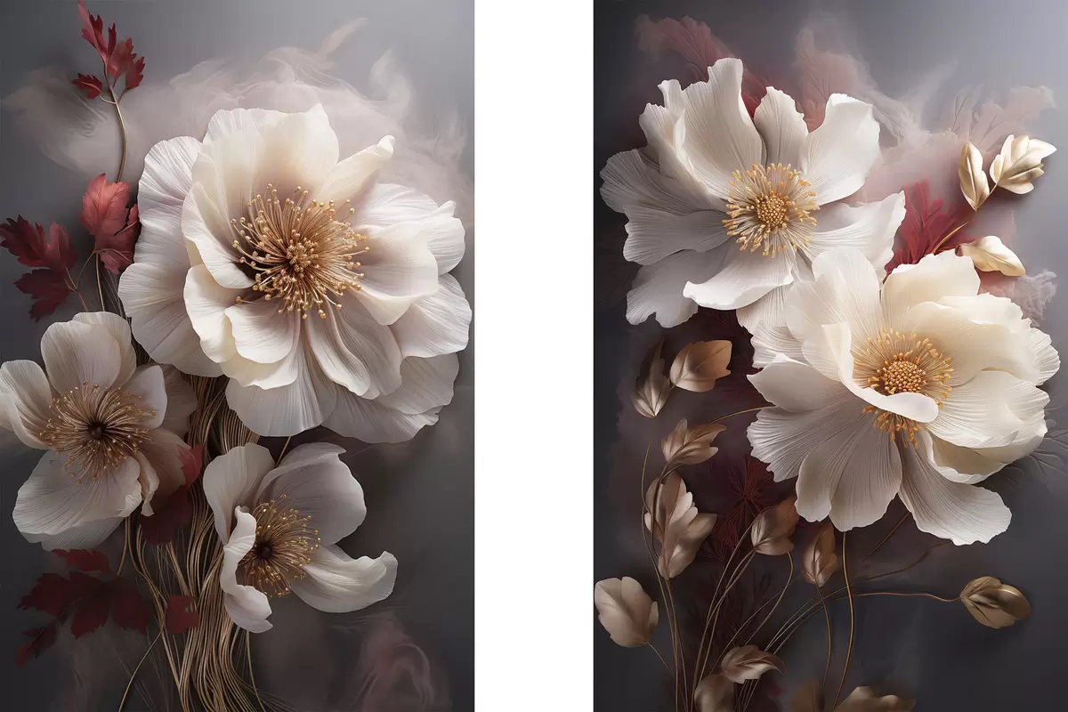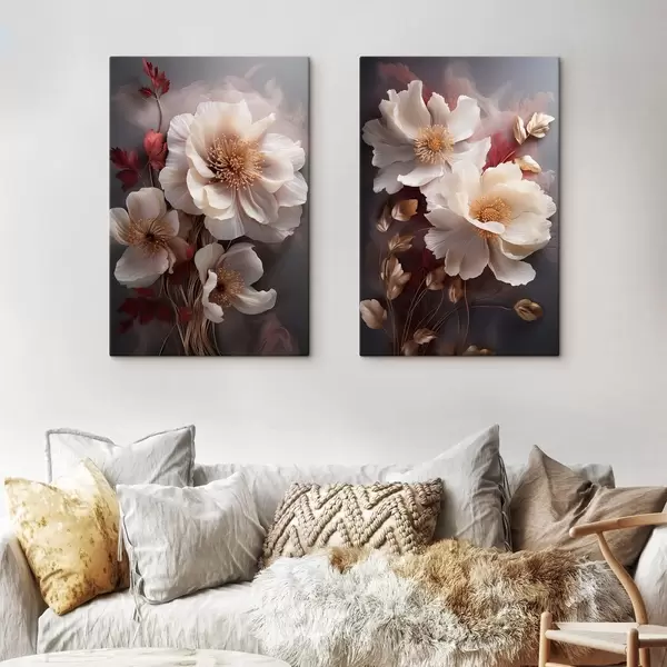 Tableau Pivoines délicates aux pétales fins et vaporeux, entourées de feuilles rouge foncé et jaunes sur fond abstrait. m01243