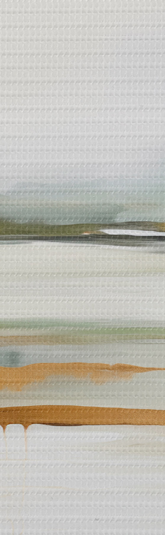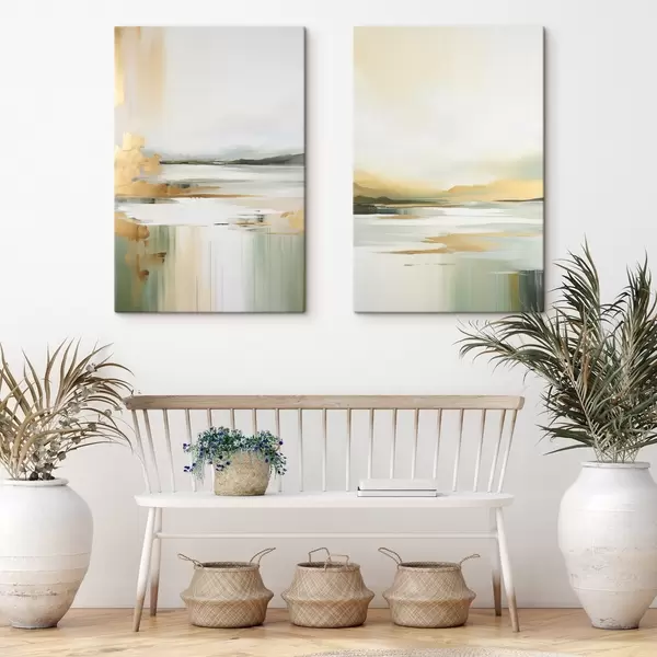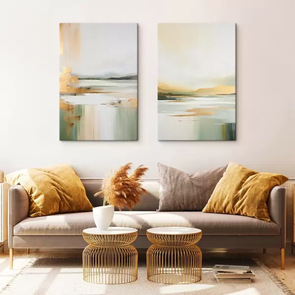 Tableau Paysage abstrait aux tons jaunes et verts, eau reflétant le ciel et les montagnes lointaines, ciel pâle et brumeux Nr m01245