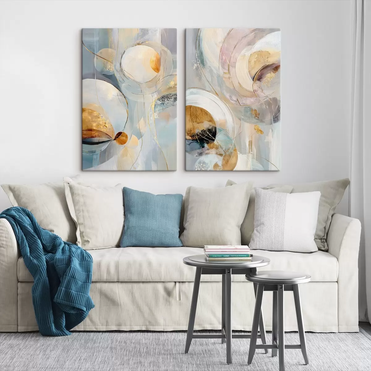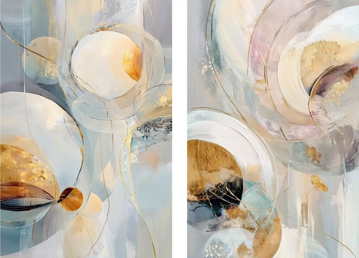 Tableau Diptyque artistique avec des cercles translucides et des coups de pinceau expressifs m30038