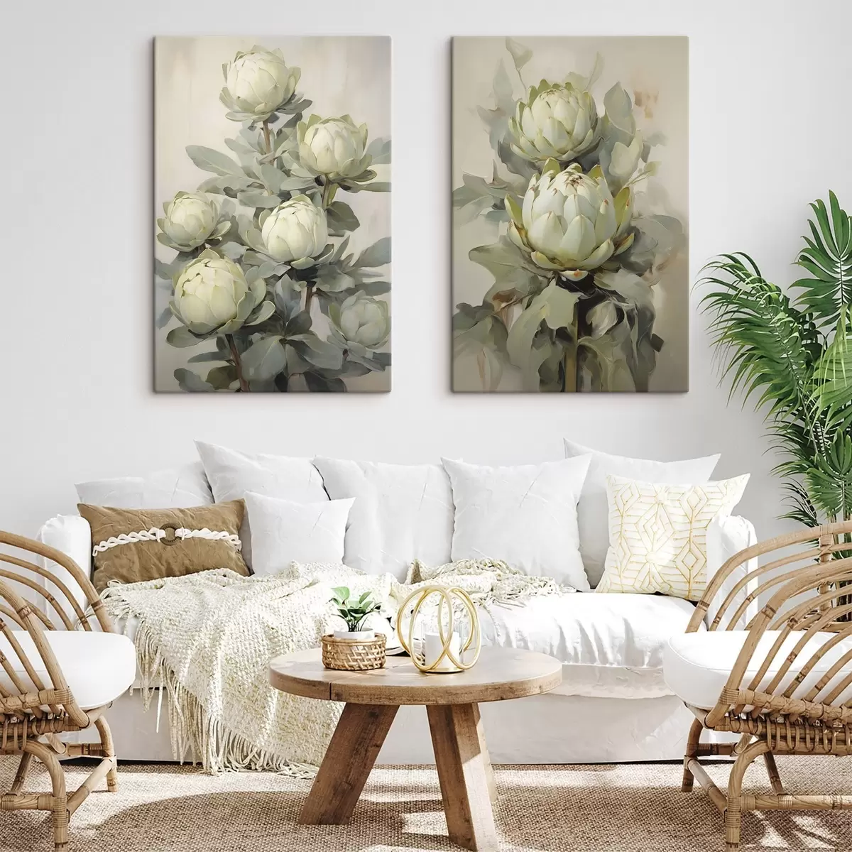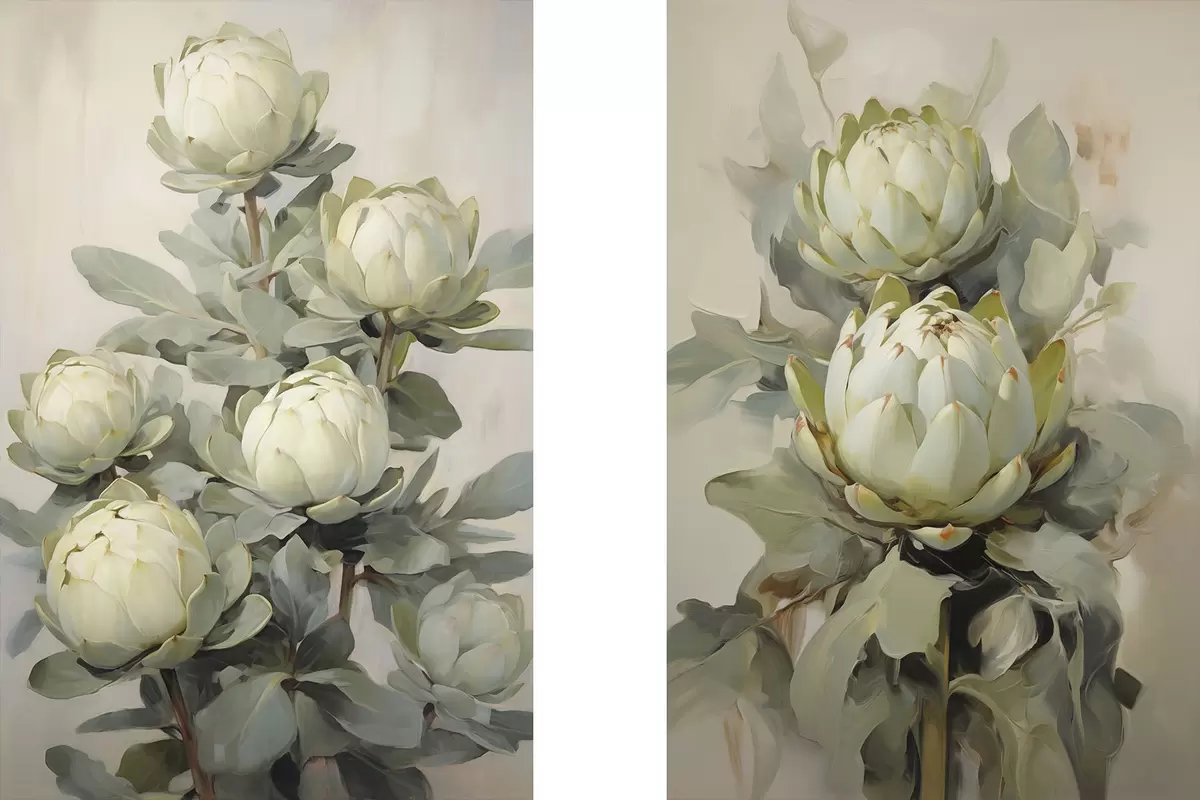 Tableau Style pictural représentant plusieurs fleurs de protéa blanches avec de grandes feuilles vertes sur un fond clair. Nr m30051