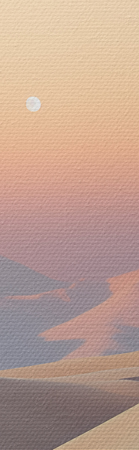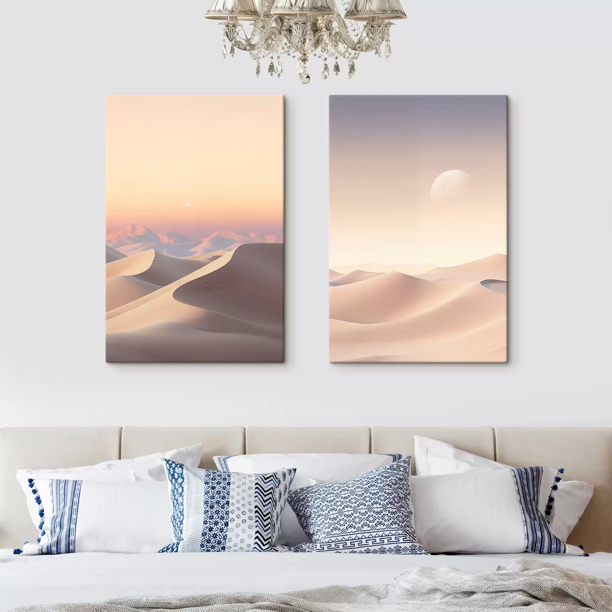 Tableau Un paysage désertique avec des dunes de sable ondulantes sous un ciel pastel doux, des montagnes lointaines en arrière-plan. Nr m30053