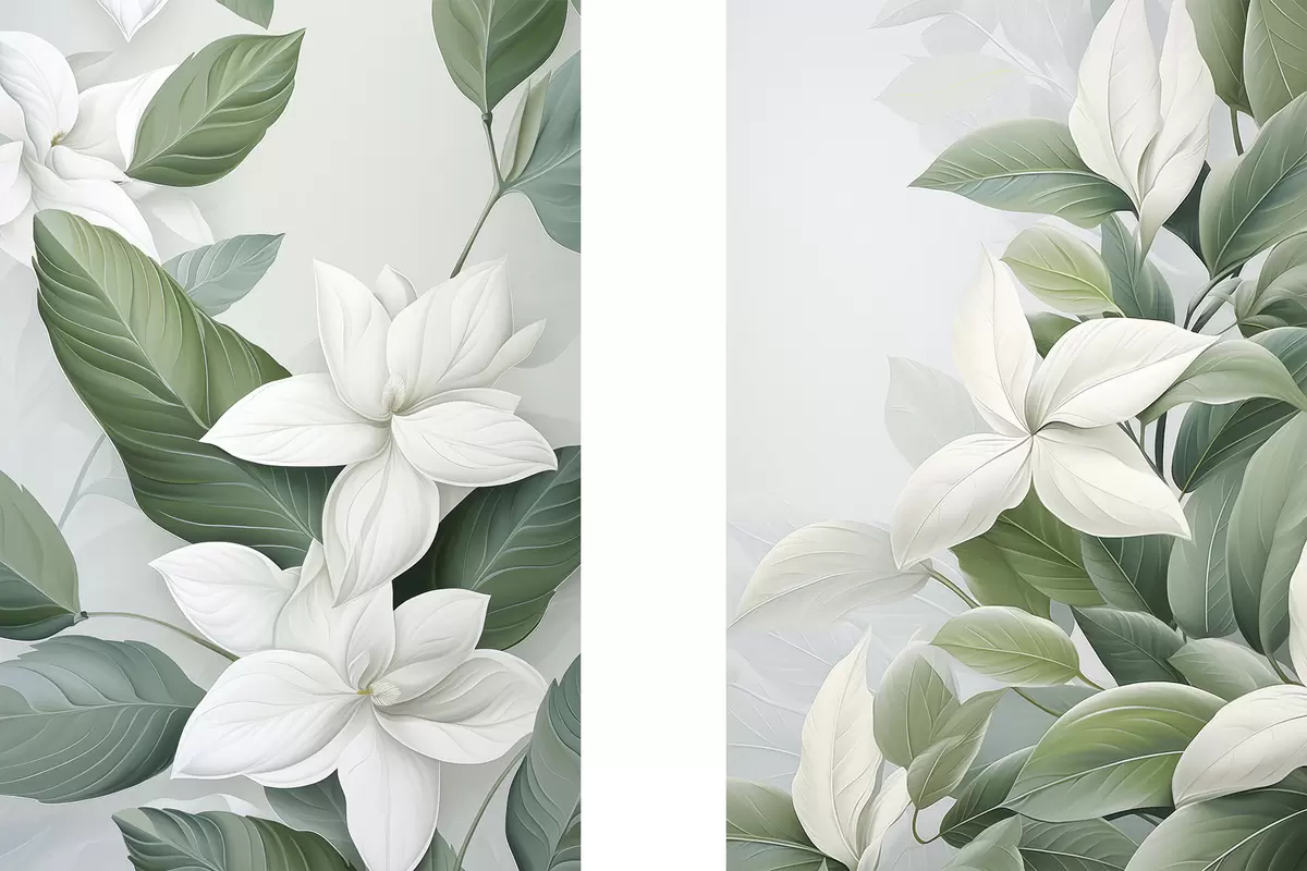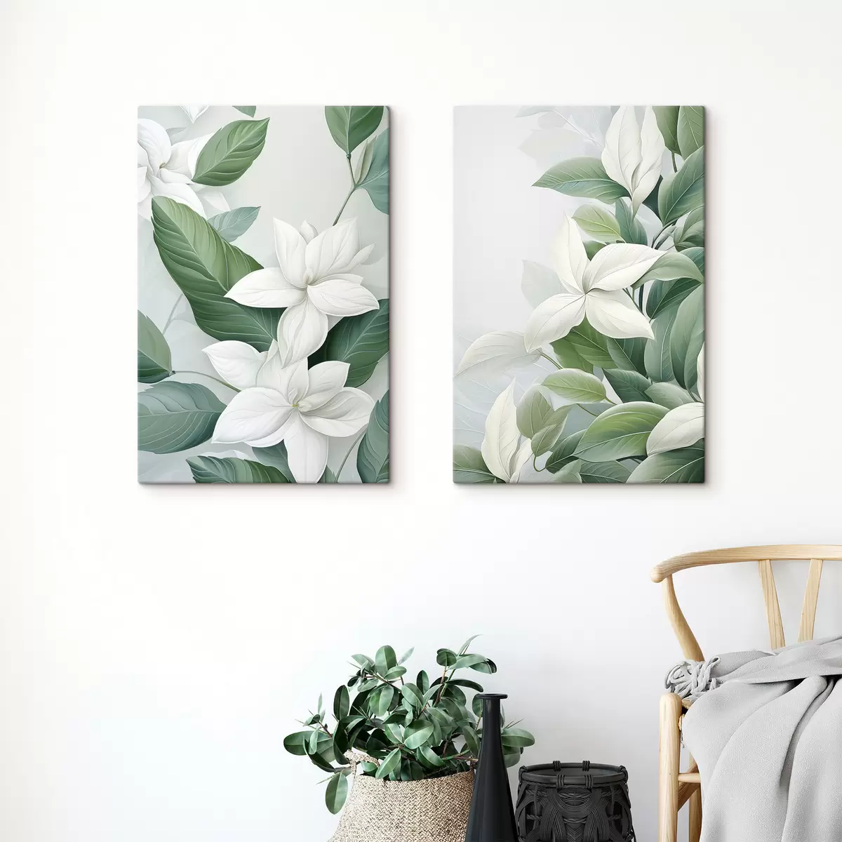 Tableau Fleurs blanches avec feuilles vertes, fond pastel Nr m30055