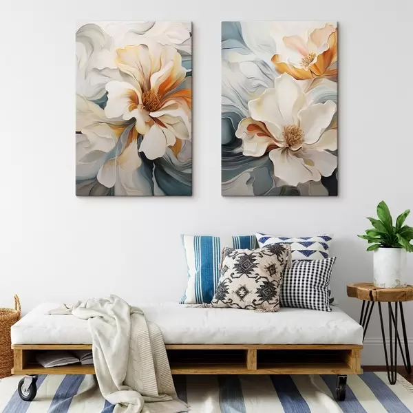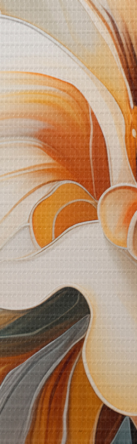 Tableau Fleur abstraite de grande taille avec des pétales blancs, orange et bleu sarcelle, fond texturé Nr m30059