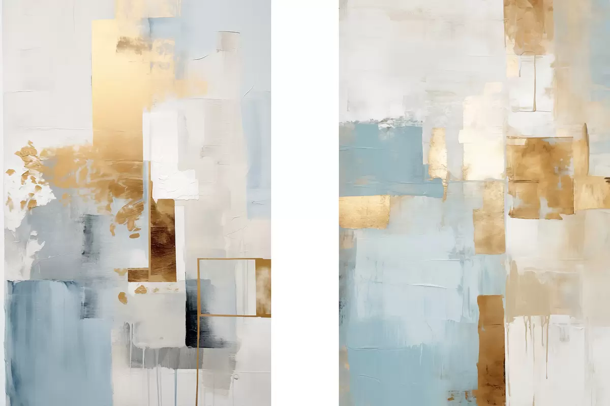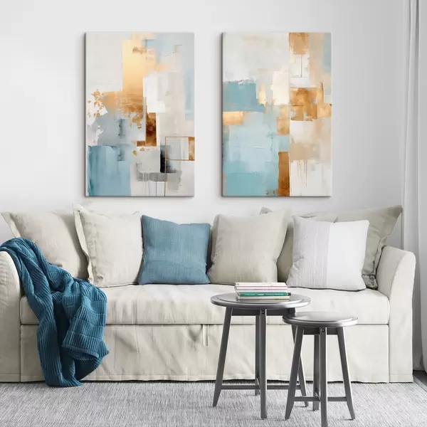 Tableau Formes géométriques abstraites aux couleurs jaune, bleu et blanc, composition texturée et minimaliste m30061
