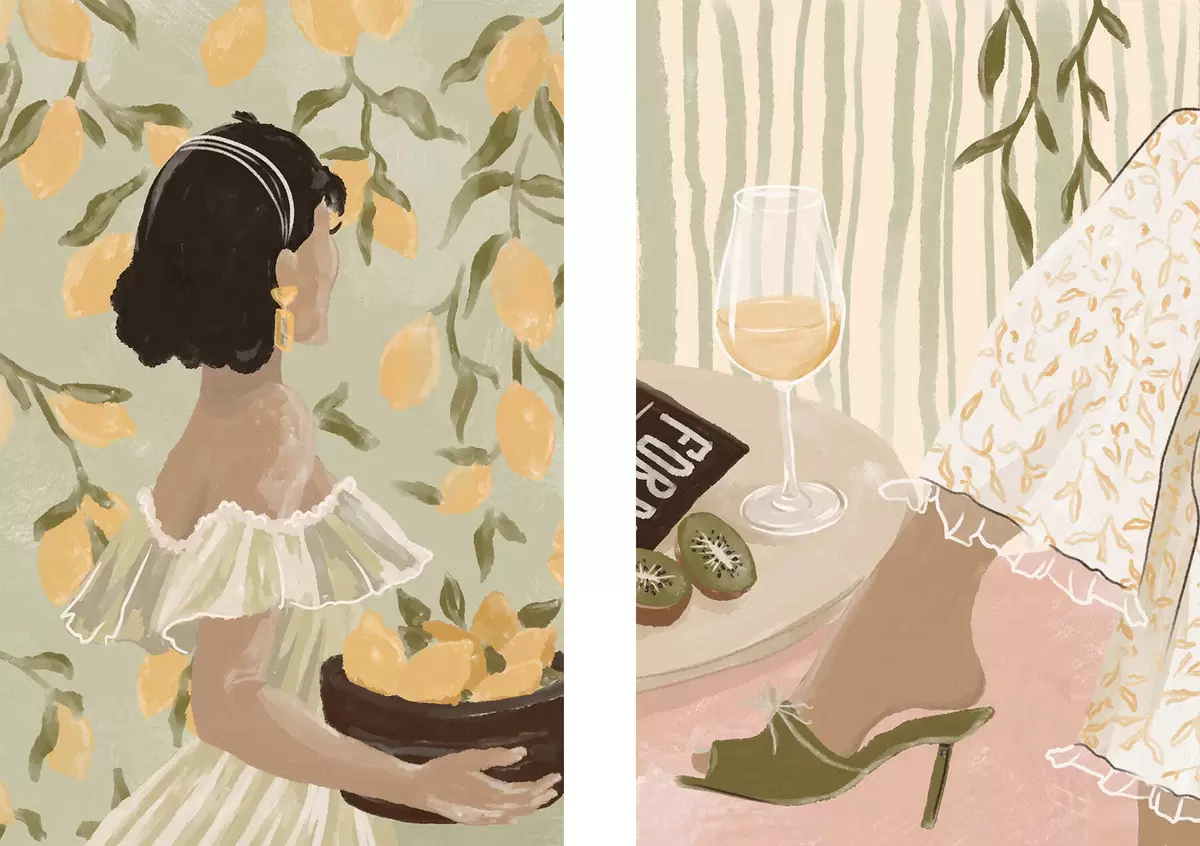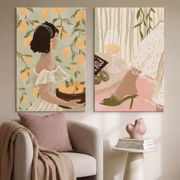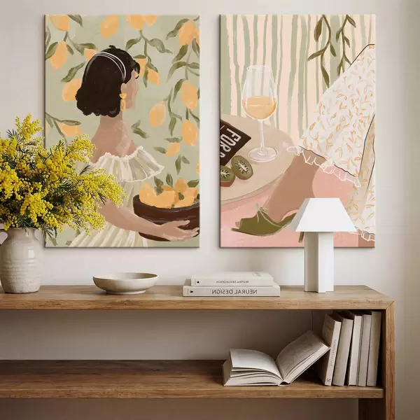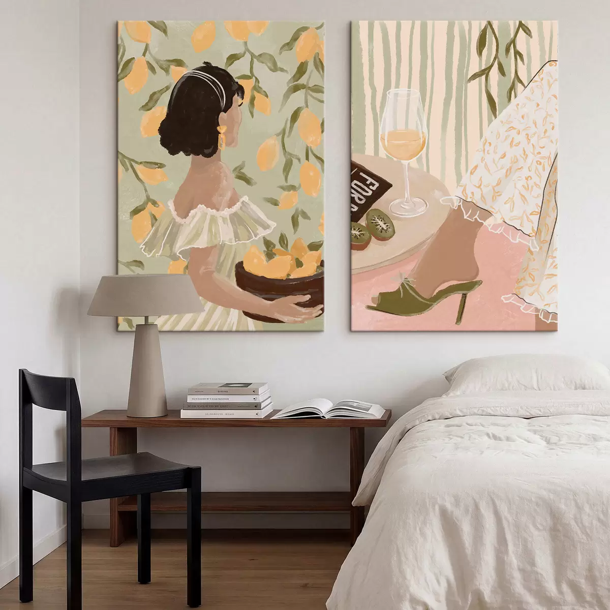 Tableau Femme avec des citrons et table avec verre Nr m30104