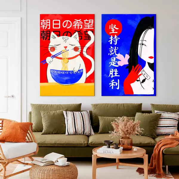Tableau Diptyque représentant un chat et le portrait d'une femme dans un style audacieux Nr m30233
