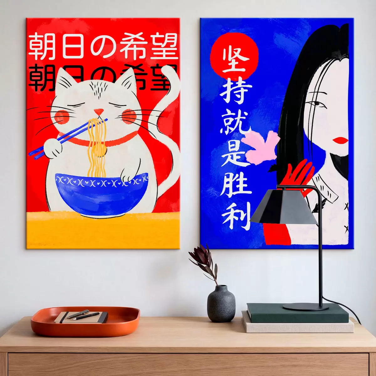 Tableau Diptyque représentant un chat et le portrait d'une femme dans un style audacieux m30233