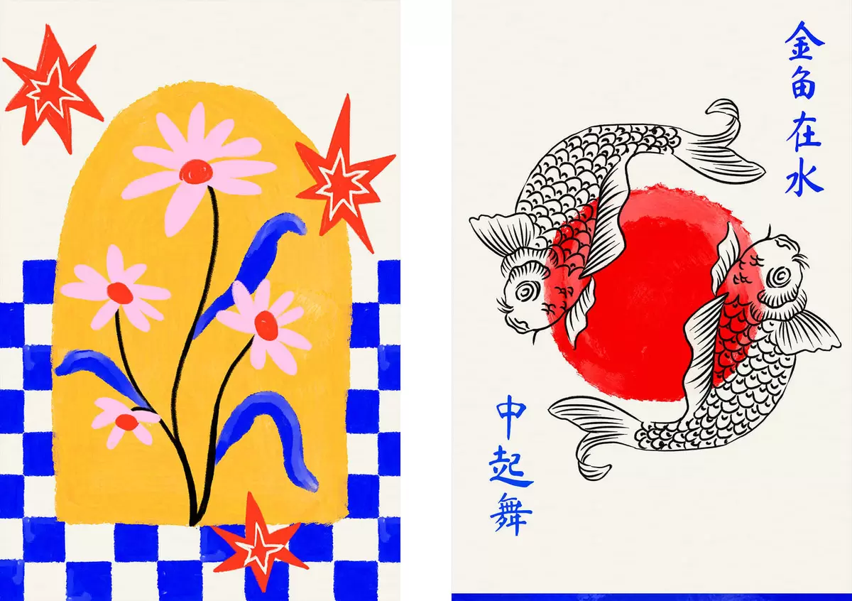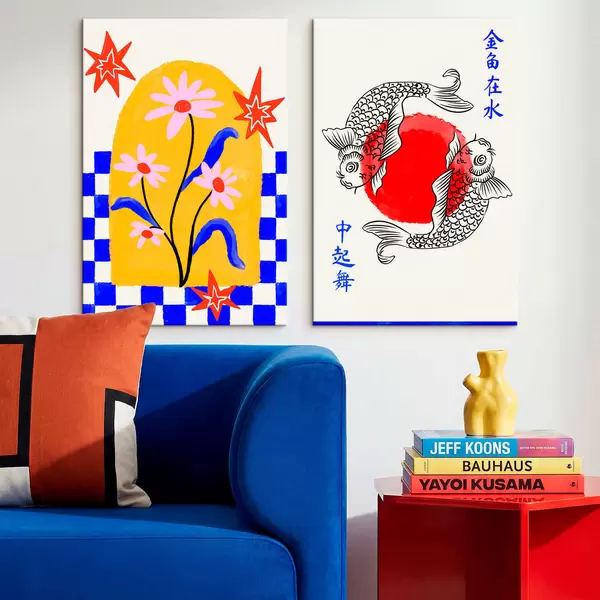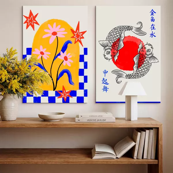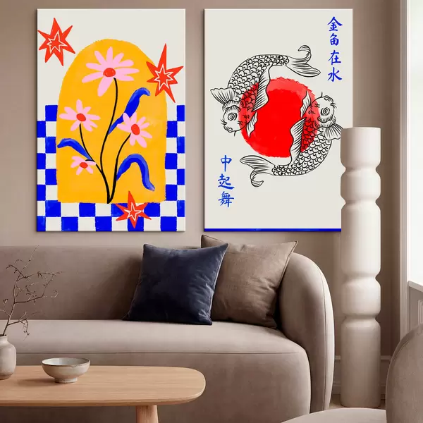 Tableau Diptyque représentant un chat et deux poissons dans des tons rouges et blancs Nr m30235
