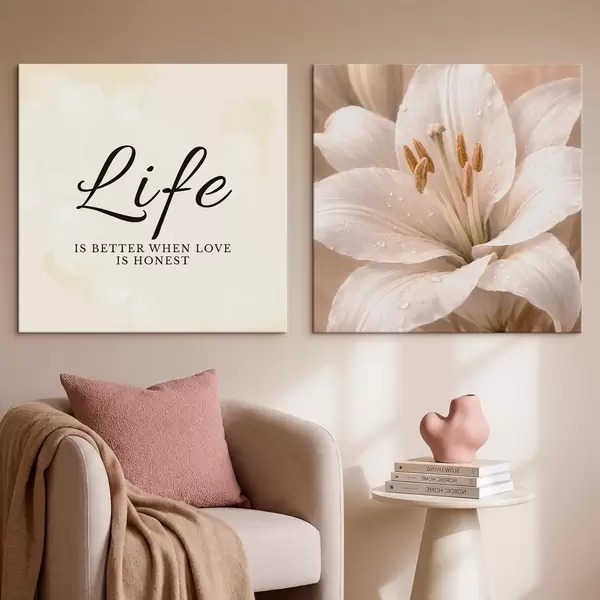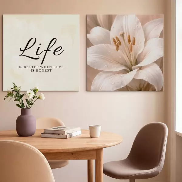 Tableau Diptyque avec le texte « Life » et un gros plan sur une fleur blanche Nr m30237