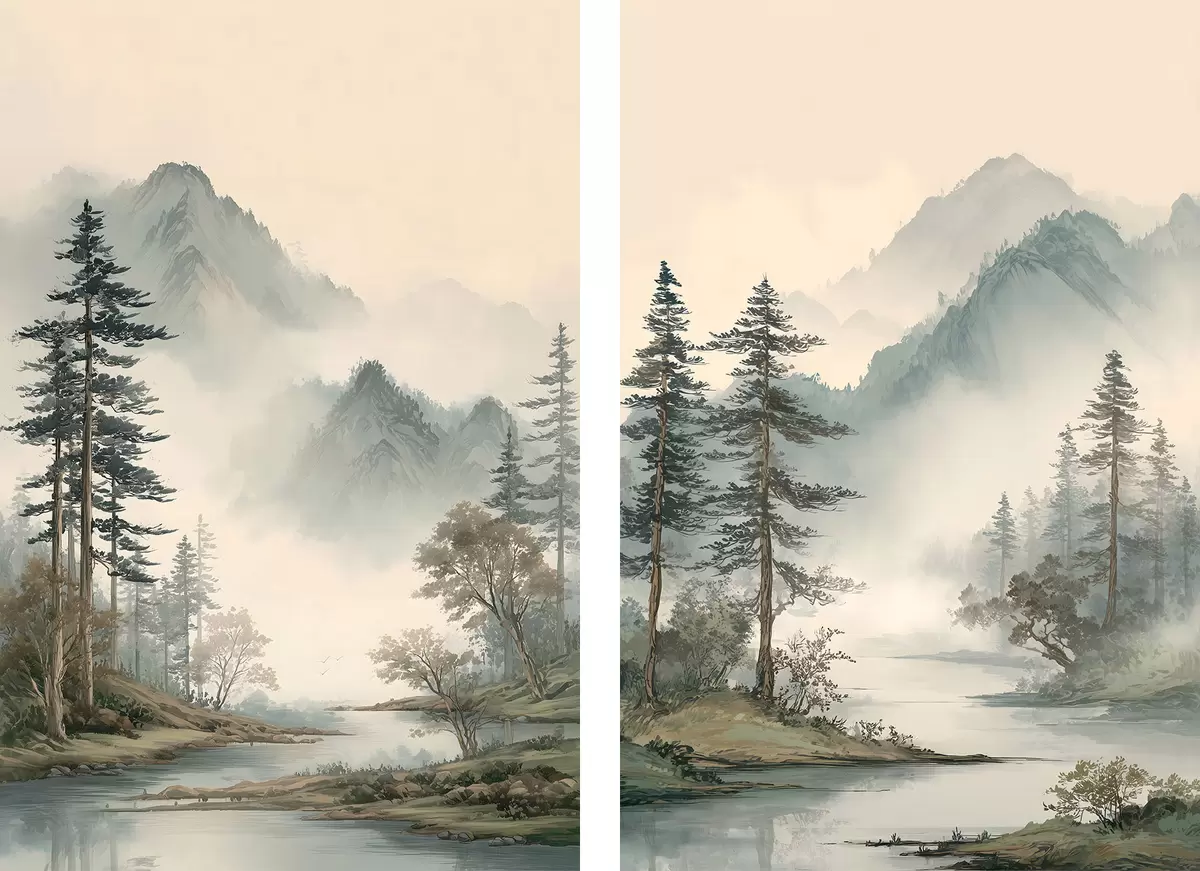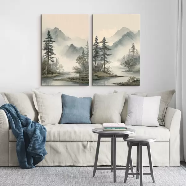 Tableau un paysage de montagne avec des pins et une rivière Nr m30262