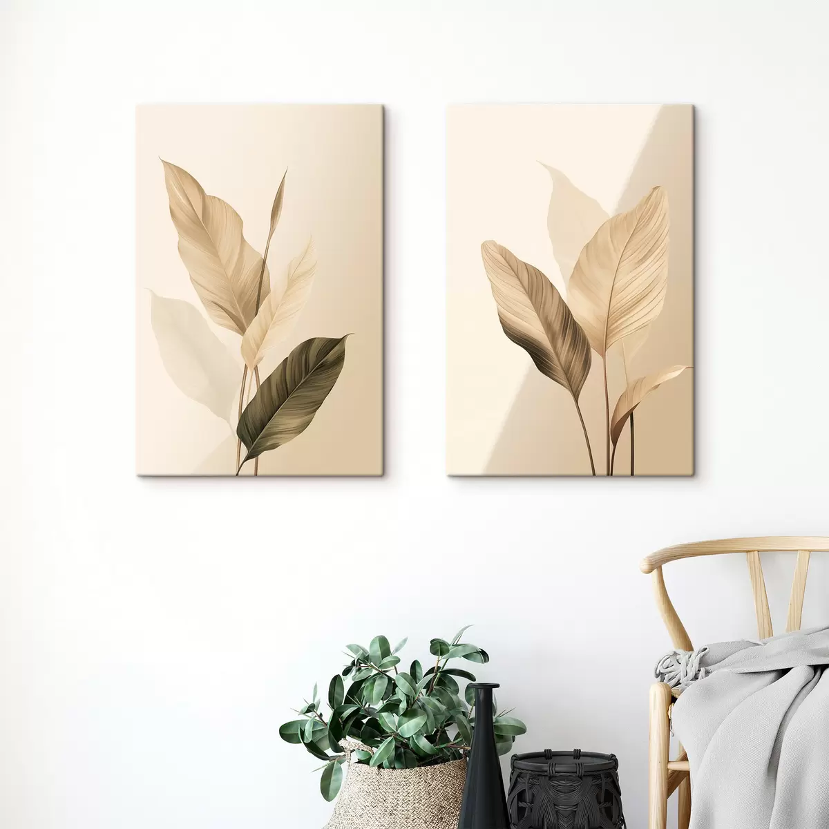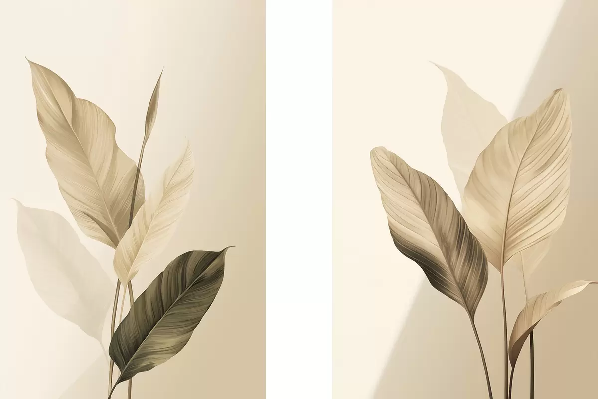 Tableau Grandes feuilles tropicales dans des tons de beige et de marron, sur fond clair Nr m30313