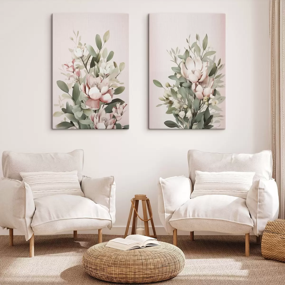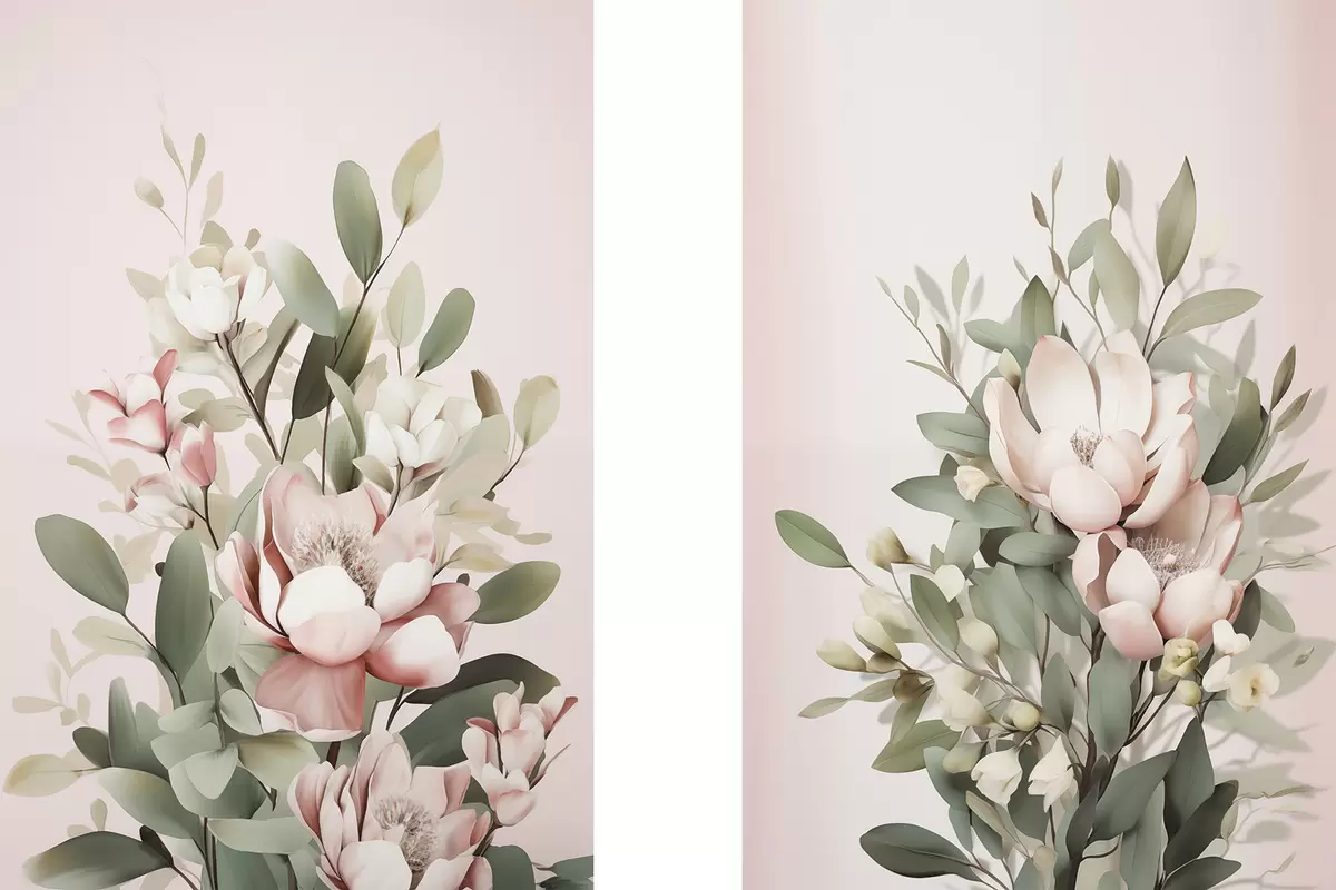 Tableau Un bouquet de fleurs aux couleurs pastel avec des feuilles d'eucalyptus, sur fond rose pâle m30314