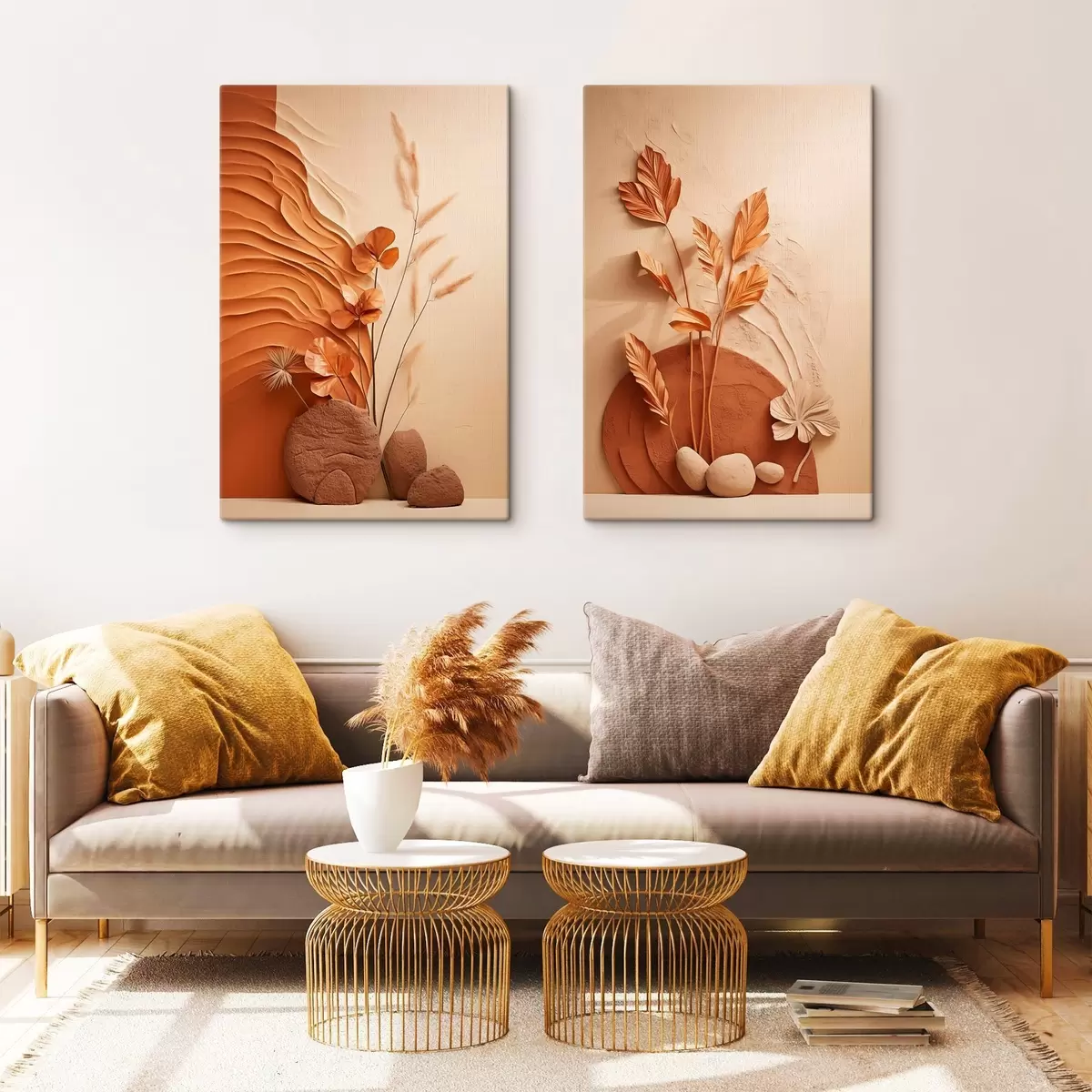 Tableau Une œuvre minimaliste composée de fleurs séchées et d'herbe de la pampa, sur un fond texturé m30320