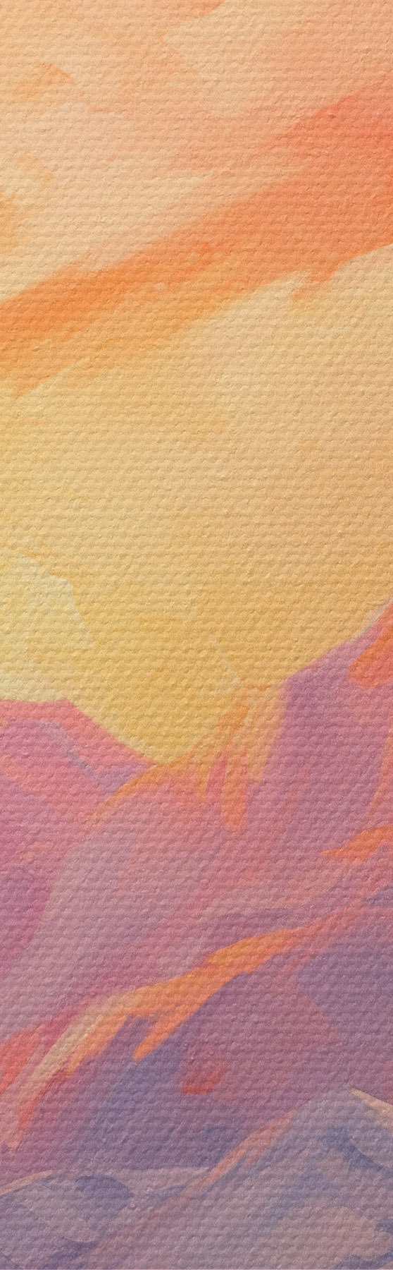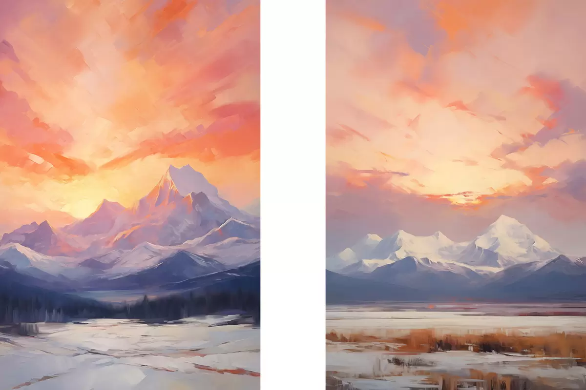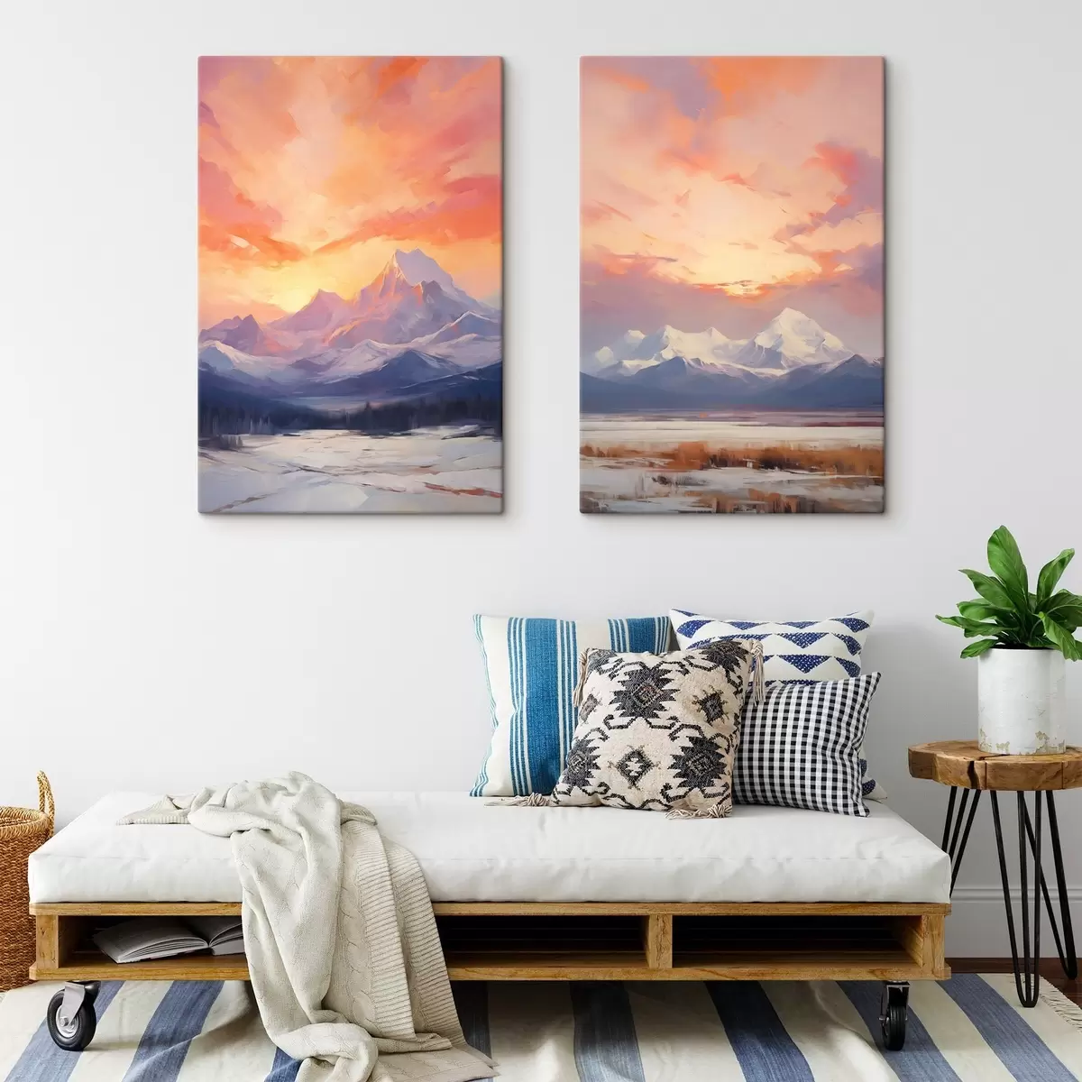 Tableau Des montagnes aux sommets enneigés sous un ciel aux teintes vives d'orange et de rose, parsemé de nuages m30321