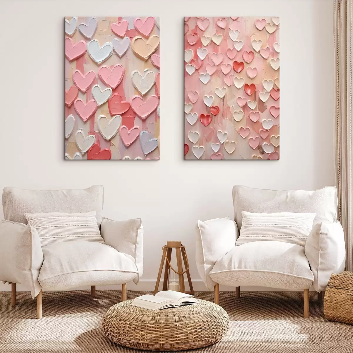 Tableau Des cœurs dans différentes nuances de pêche et de rose, réalisés dans un style texturé et peint m30326