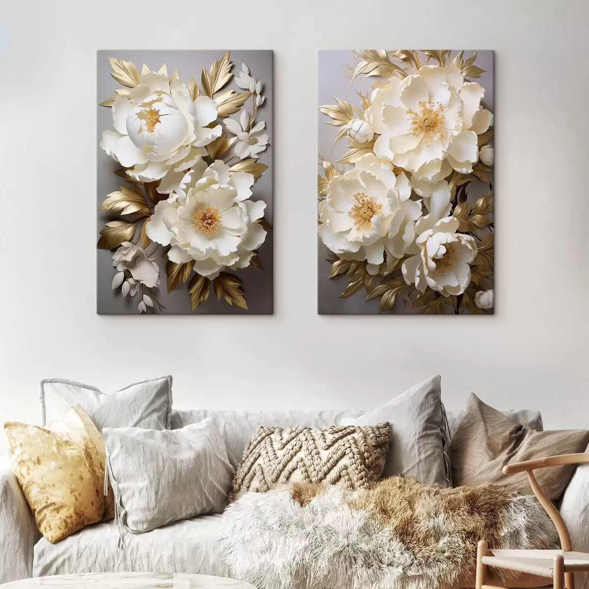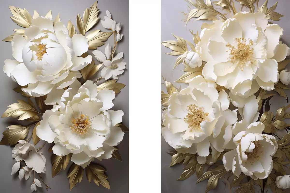 Tableau De grandes pivoines blanches aux feuilles jaunes sur fond gris Nr m30327