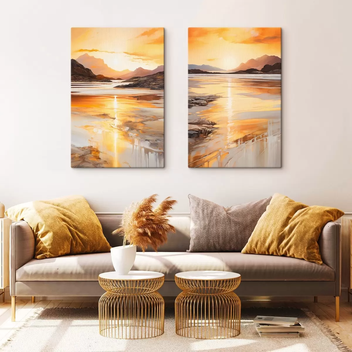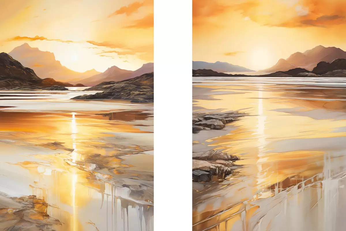 Tableau Un paysage avec une rivière et des montagnes sous un ciel orange aux teintes chaudes, au coucher du soleil Nr m30328