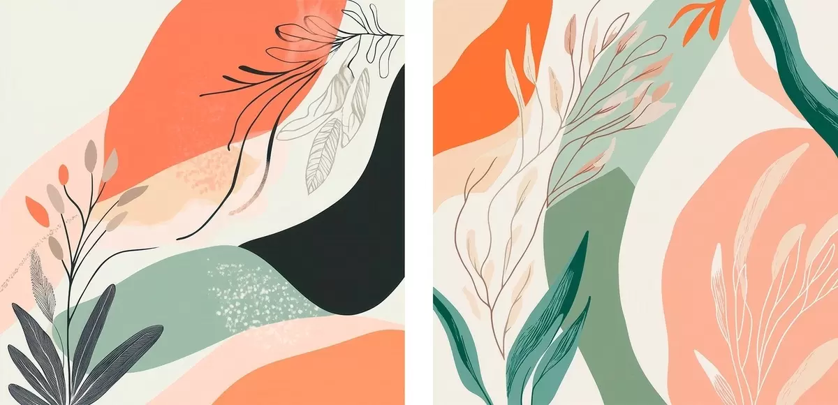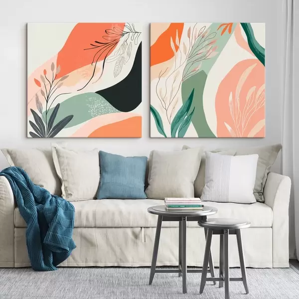 Tableau Diptyque abstrait avec des motifs végétaux et des touches de couleur, dans un style moderne m30347